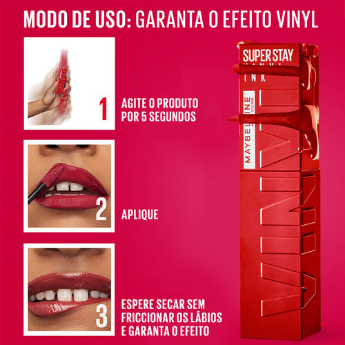 O Batom Líquido Super Stay Vinyl Ink proporciona um efeito de cor intensa com um acabamento espelhado e brilhante, deixando os lábios com uma aparência bonita e vibrante.